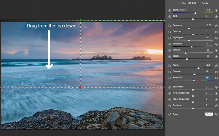Click and drag the Graduated Filter from the top down to select the sky. Then select with adjustments you want to apply.